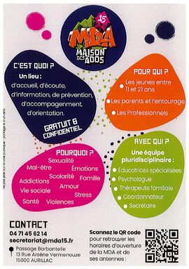 Lieu GRATUIT et confidentiel d'accueil, d'écoute, d'information, d'accompagnement, de prévention et d'orientation pour tous les jeunes de 11 à 21 ans, leurs parents et entourages. RDV? 0471456214 ou secretariat@mda15.fr ou site internet mda15.fr