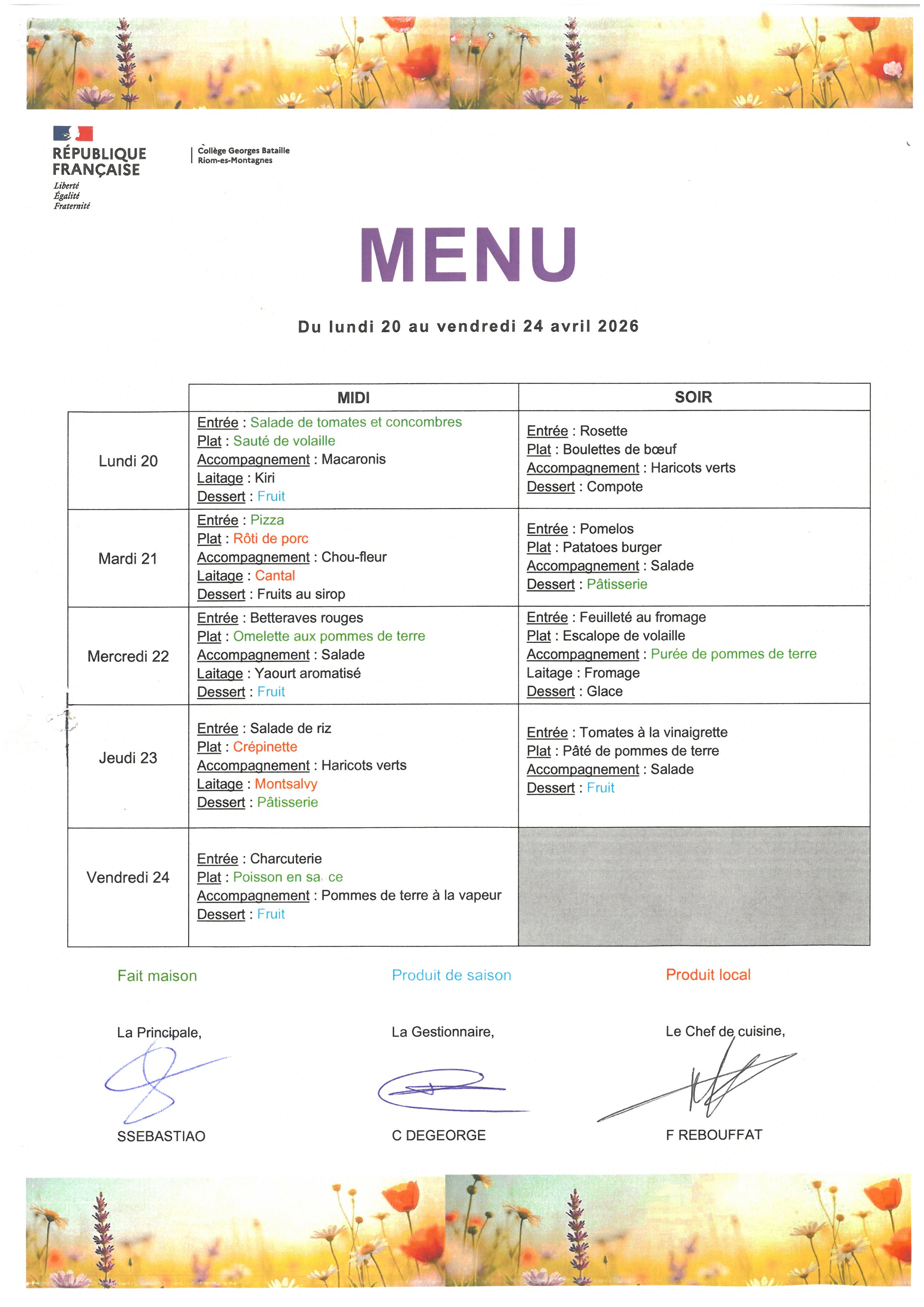MENU DU 20 AU 24 AVRIL